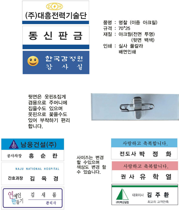 아크릴 명찰이며 뒷면 집게&옷핀 겸용